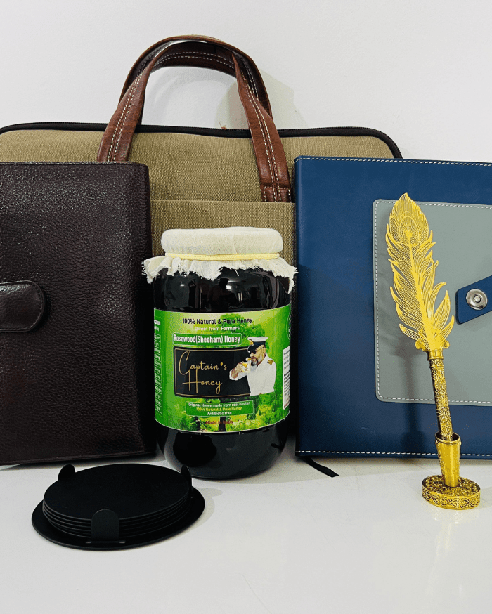 The Captain’s Ultimate Executive Collection. This is a premium gift set that combines professional elegance with the pure essence of nature. The hamper includes a variety of high-quality accessories alongside our signature honey, making it an ideal gift for corporate clients, business partners, or employees.
