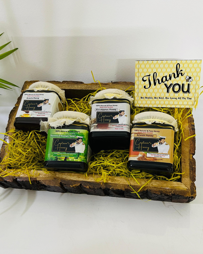 Presented in a rustic wooden tray with a thoughtful “Thank You” note, this hamper is an ideal way to explore a range of pure and natural honey varieties.