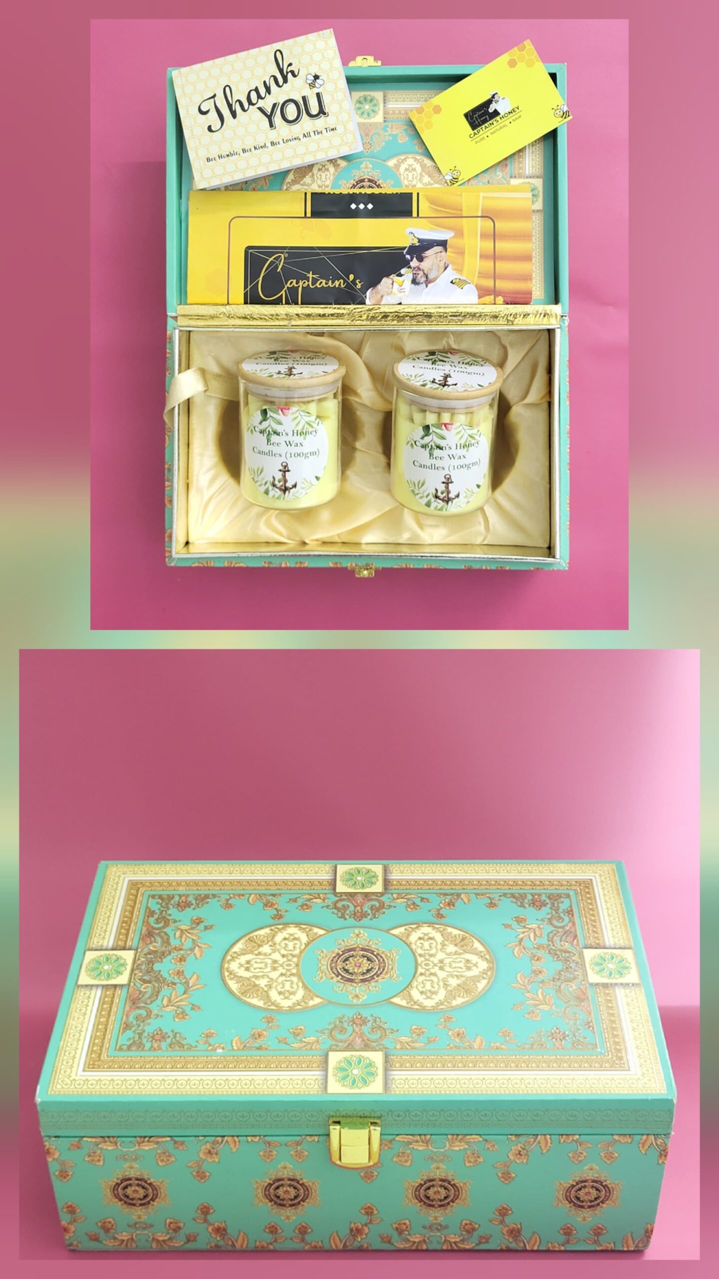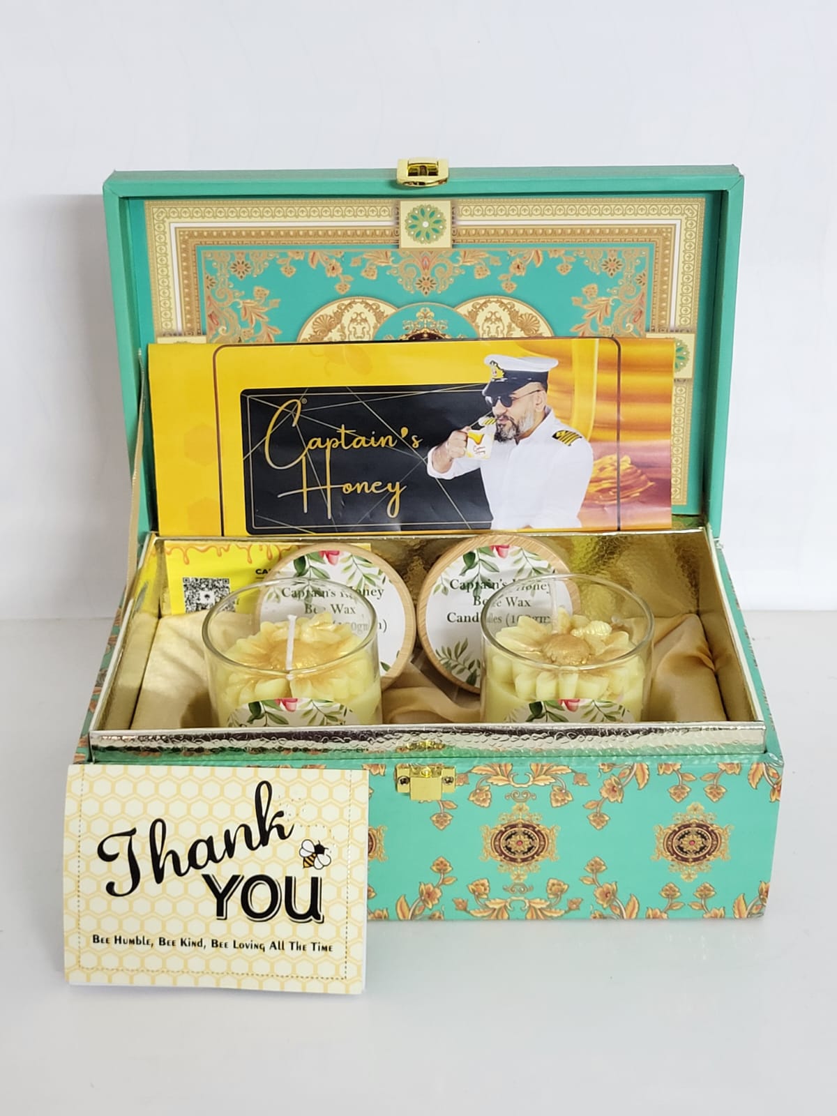 Golden Light Hamper illuminate your, featuring two Captain’s Honey Bee Wax Candles and two glass jar candles. Handcrafted and eco-friendly, they radiate warmth, purity, and serenity—perfect for festive gifting or decor.